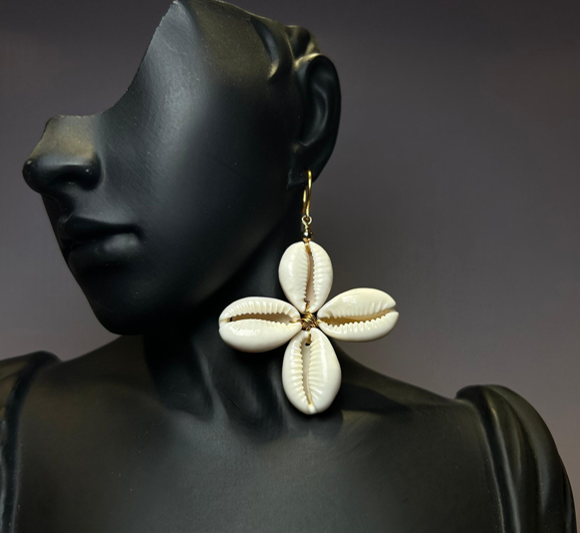Description: Fully intact cowrie shells; constructed with gold wiring in 4-clover leaf inspired design.